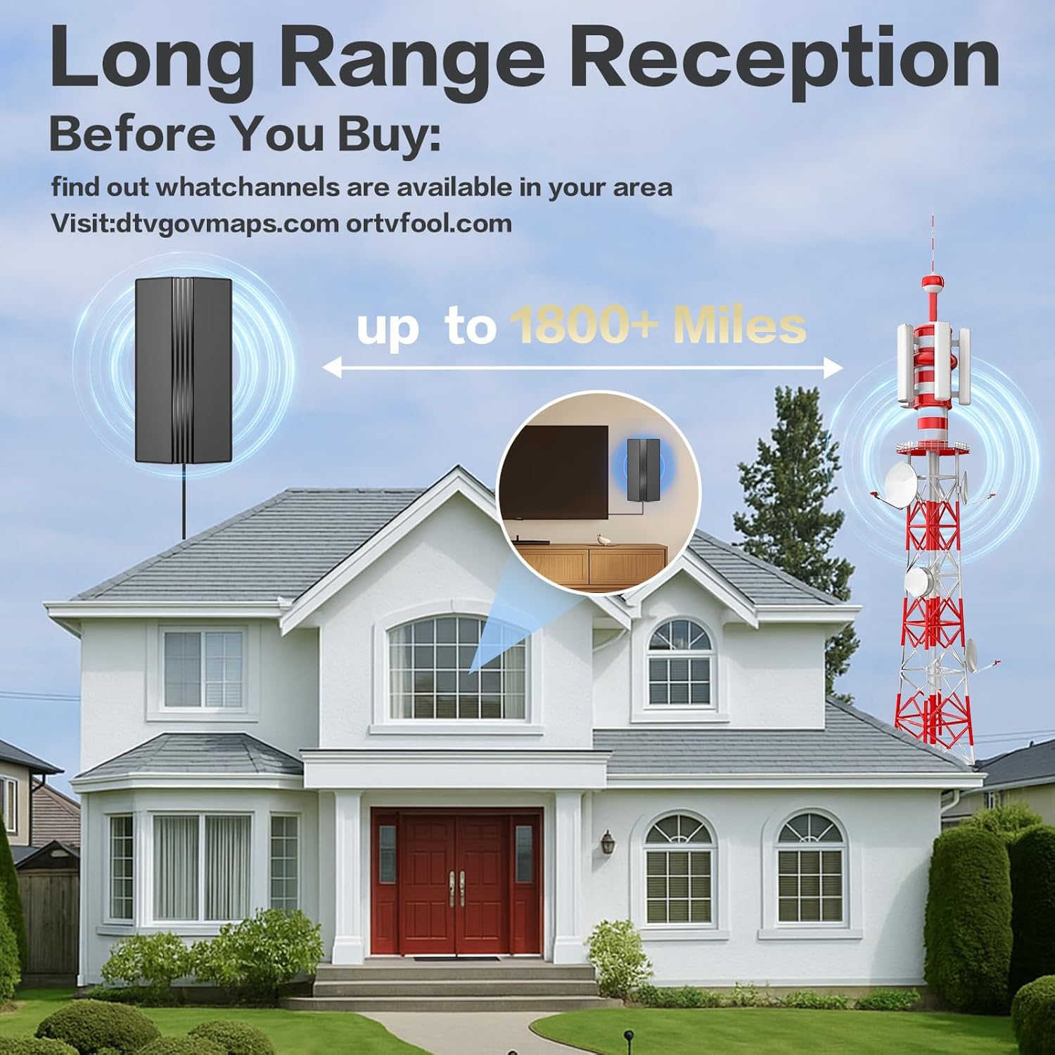 - 📡𝐋𝐨𝐧𝐠 𝐑𝐚𝐧𝐠𝐞 𝐒𝐢𝐠𝐧𝐚𝐥 𝐑𝐞𝐜𝐞𝐩𝐭𝐢𝐨𝐧: This TV antenna offers an impressive 2200+ miles range, providing clear and stable reception for local channels. Whether you’re using it as a TV antenna indoor or outdoor, it ensures excellent signal reception, making it perfect for smart TV and all TV types.
