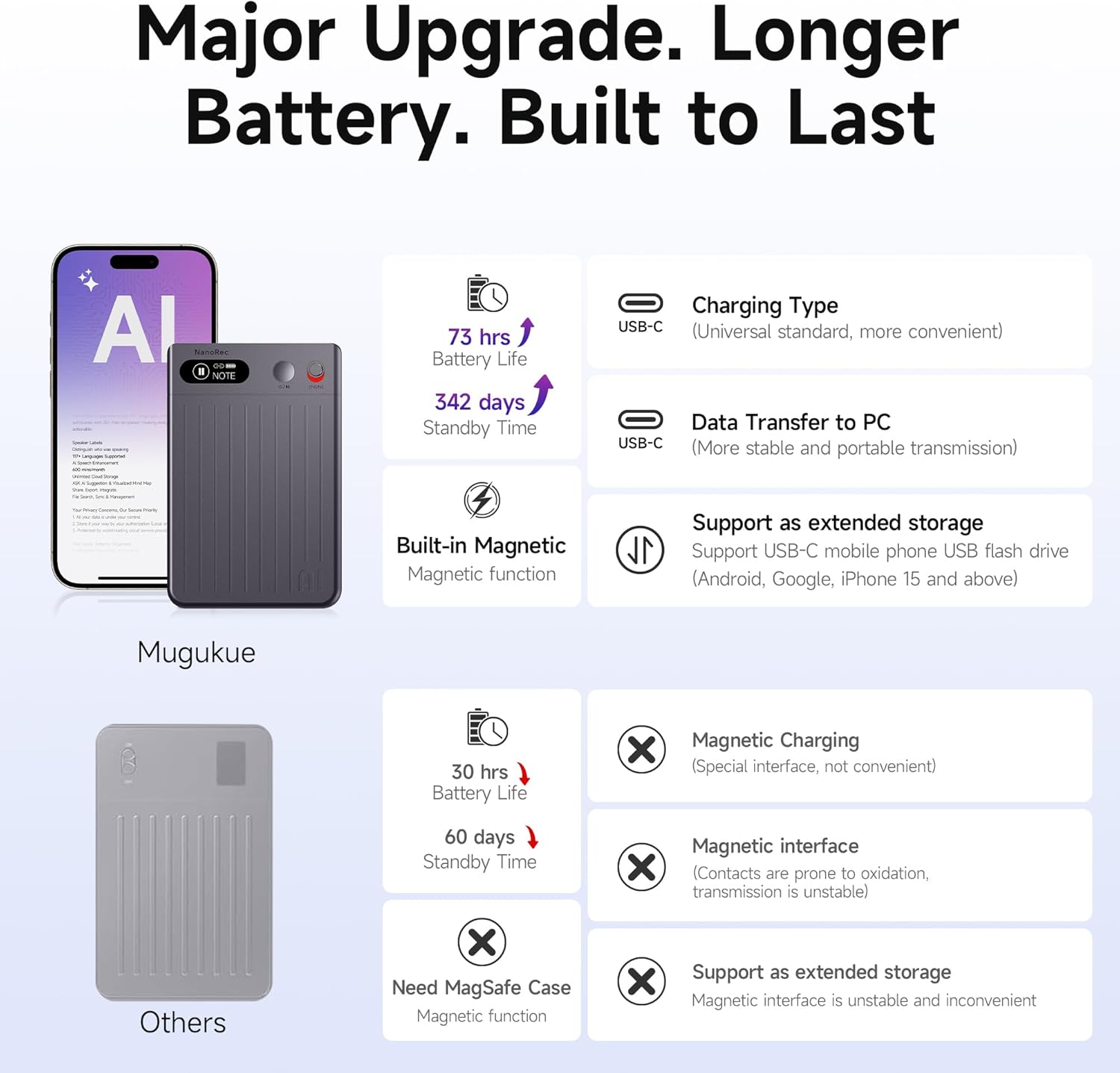 • INDUSTRY-LEADING 73-HOUR BATTERY LIFE – 2X LONGER THAN STANDARD MODELS: Say goodbye to frequent charging. Mugukue NanoRec ai voice recorder offers an unmatched 73 hours (4380 minutes) of continuous recording—over twice the average 30-hour battery life of most audio note recorders. Combined with 342 days standby time, it’s the ultimate solution for multi-day conferences, academic projects, or long-term travel.
