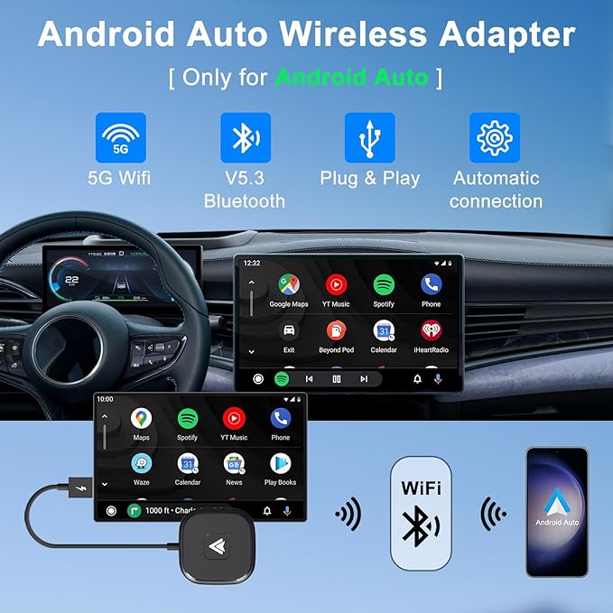 • 【Android Auto Wireless Adapter for Car】Easily upgrade wired Android Auto to be wireless and experience the freedom of wireless Android Auto. Just simply plug the Android Auto adapter into your car’s USB-C/USB port, and you can enjoy the full Android Auto function and keep the original car operation, such as navigation, music playing, voice assistance, phone calls, etc(Only compatible with Android Auto, not for any other system).