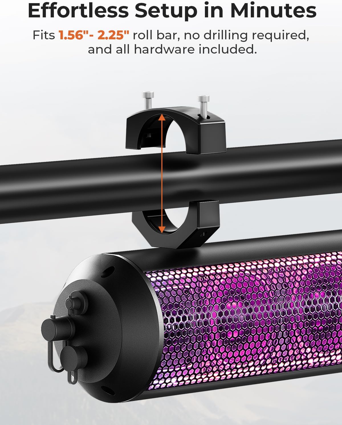 • Vibrant RGB Light Modes: The kemimoto 28 inch 6-speaker UTV sound bar features dynamic RGB lights with 5 different illuminating modes (music sync, solid, fading, jump, or off). The multicolor lights in sync mode can pulsate and groove to the beat of your music. When you don’t require the RGB light, simply turn it off using the remote control to conserve battery life