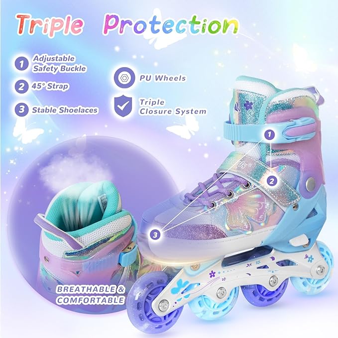 - Most Anticipated Gift for Children – The unique butterfly and flower design makes skating more charming. This is an ideal pair of Inline skates, which helps children develop balance and coordination ability and improve their physical fitness. The children will be happy to receive this high-quality gift.