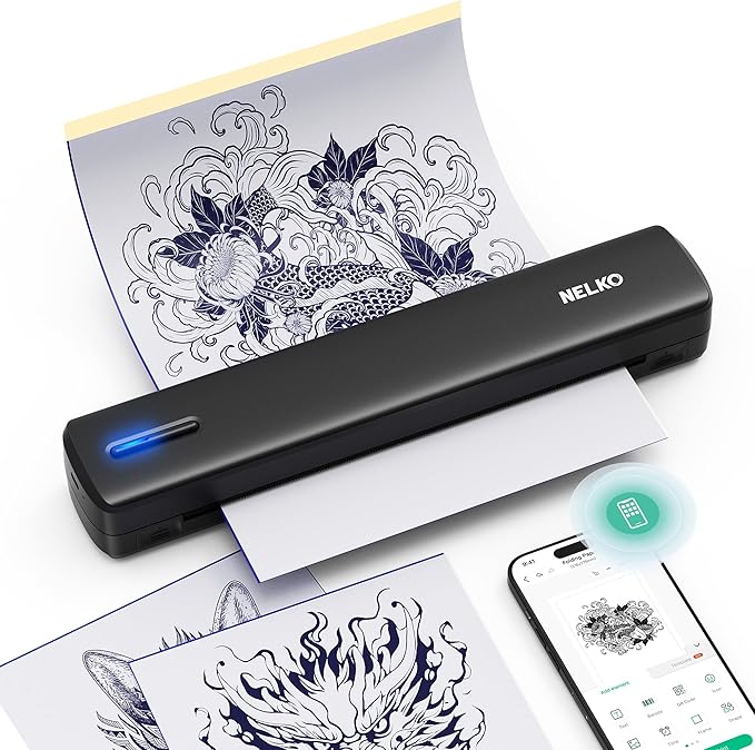 • Clear Printing: Nelko Thermal tattoo printer uses high-definition printing technology, providing you with clear printing. Thermal printing mode, no need for ink and toners, saving your cost. This Bluetooth tattoo printer machine equipped with 1500mAh high-capacity battery, fully charged can work continuously for 49 minutes and print 200 sheets of tattoo transfer paper. For optimal printing results, we recommend using Nelko Tattoo Transfer Paper