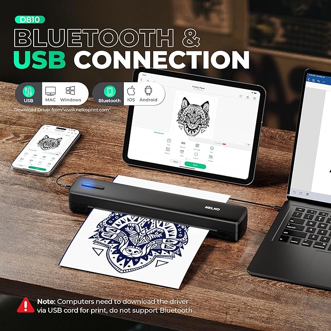 • High Compatibility: Tattoo stencil printer supports iOS 13 or above & Android and PC, NOT support Chromebook. For smartphone, please download the “Nelko” APP to print via Bluetooth. For PC, please visit ” Nelkoprint.com” or download form the attached U-disk to obtain the driver. Please DO NOT connect the tattoo printer directly via Bluetooth for all devices. Note: Computers need to download the driver and print via USB cord, computer can not connect to the printer via Bluetooth