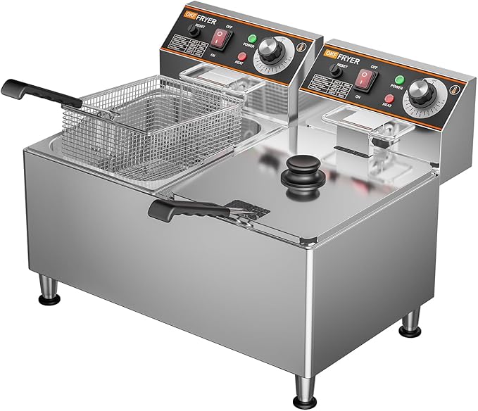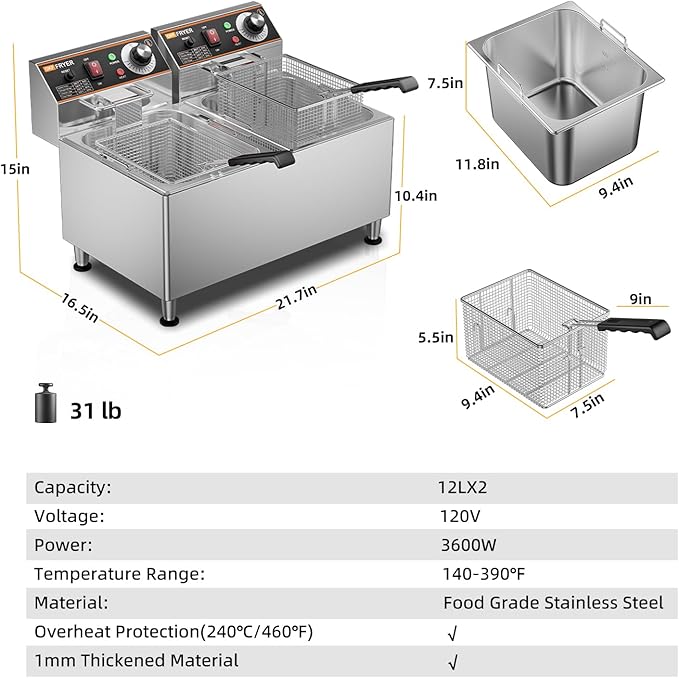 • 【Quick Heating】This commercial deep fryer is equipped with a powerful 1800W heating element in each basin that guaranteed to fry food quickly and maintain oil temperature. Perfect for frying chips, french fries, chicken wings, chicken legs, fish, shrimp, doughnuts, fritters, onion rings, etc.