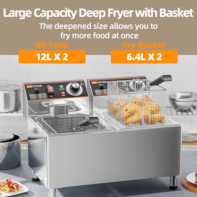 • 【Large Capacity】OKF deep fryer has 2 x 12L large oil tank and 2 removable large baskets. The deepened size allows you to fry more food at once, and the hook of the baskets is easy to hang the basket up to drain the oil quickly.