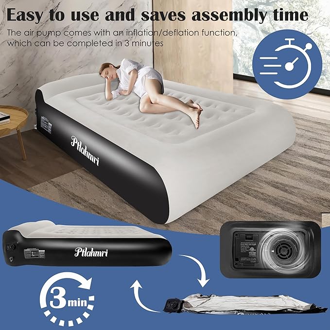 - Easy To Us:High-Powered (110-120V) queen air mattress with built in pump ,With inflation and deflation functions,You only need to connect the socket to the power supply of the air mattress and turn the button to start inflating or deflation. It only takes three minutes to complete without long waiting.
