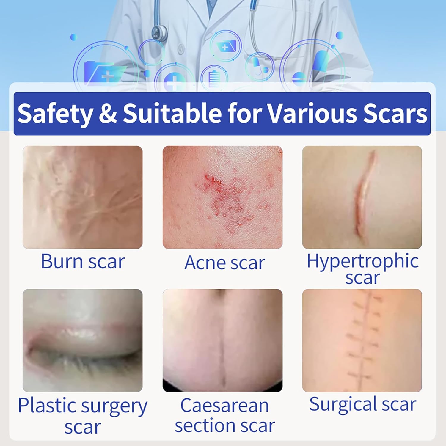 - Medical-Grade: Silicone scar tape made with 100% soft, medical-grade silicone,its flexible and self-adhesive design.The hospital-grade tape is very thin and soft, The thin scar patch has good breathability, which makes the skin feel comfortable, easy to apply and stays where you put it,opaque with a “skin tone” coloring,removal was not painful. Doesn’t leave any residue on your skin. Long term use will not cause allergies, rashes, or other symptoms