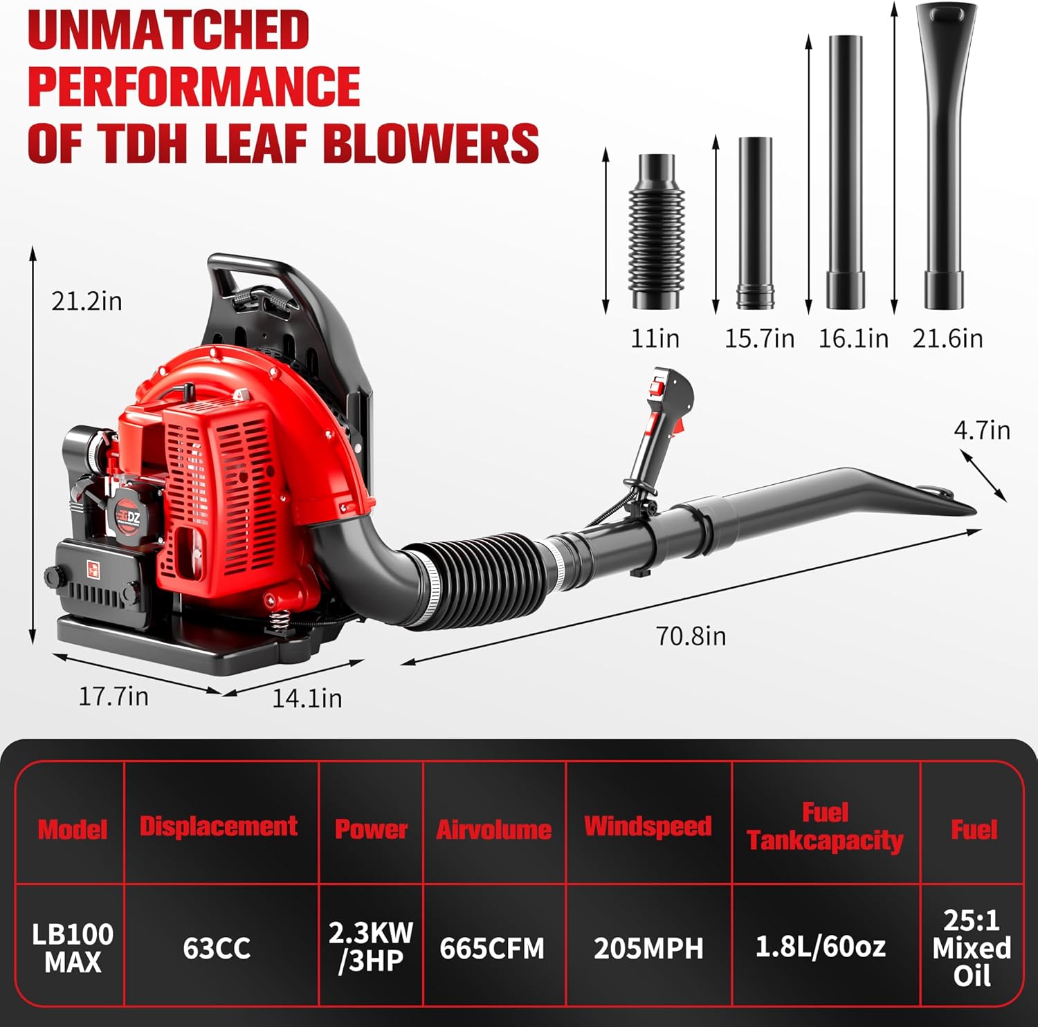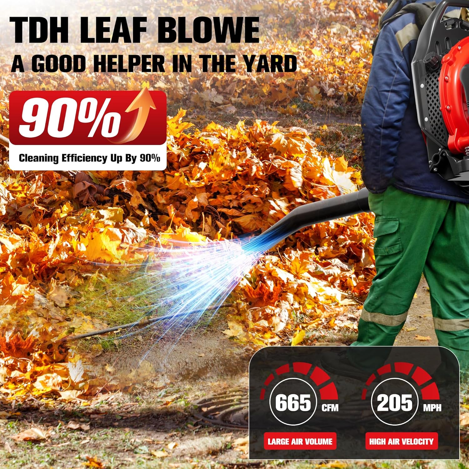 - Save Hours with 63CC Power: Power through wet leaves, debris, or light snow at an incredible 205 MPH. The TDH Gas Backpack Leaf Blower’s robust 2-stroke engine and 665 CFM airflow make quick work of large lawns or commercial spaces, slashing cleanup time while delivering unbeatable performance