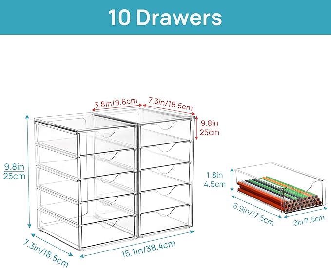 - 【2 Pack Desk Organizers with 10 Drawers】 Our package comes 2 pack organziers with total 10 drawers. Maximize space on office desks, cabinet shelves,vanity, dressers ,bathroom countertops. They are ideal to organize all your small messy items into each contianer, making it easier and convenient to find and use. You can also use them side by side and put some decorative items on top of acrylic bins,which help you creat a tidy and enjoyable space.