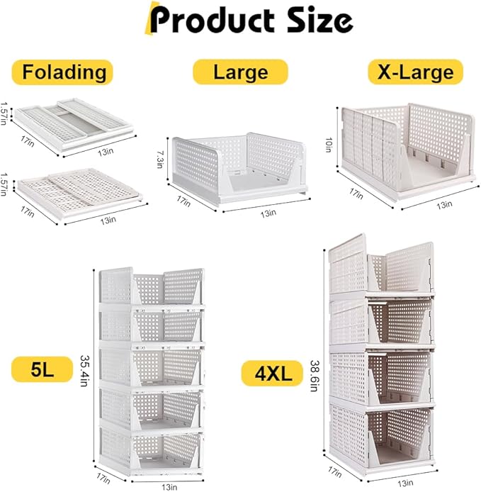 • Clothing Classification—XL foldable closet organizer and storage bins size for one: 17″(L)x13″(W)x9.6″(H), 4 Pack XL stacked size: 17″(L)x13″(W)x38.6″(H), Higher than L size, more suitable for winter sweaters, coat,towels,large toy, baskets, underwear.Extra larger collapsible storage bins, perfect for you to store large sweatshirt organizer items in,weekly clothes organizer for kids