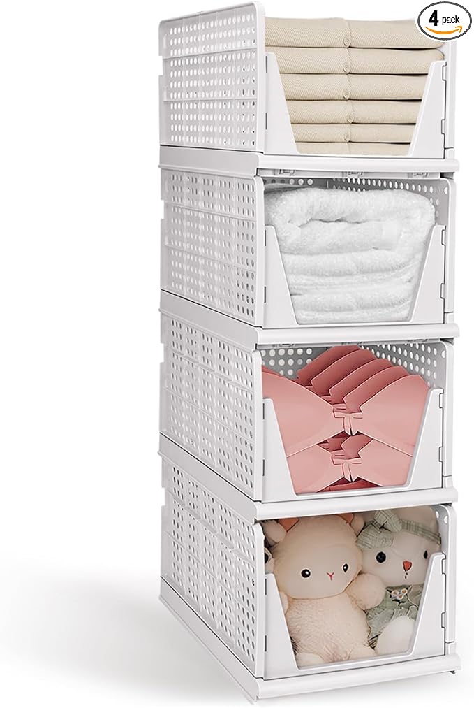 XL Stackable Plastic Storage Basket, 4 Packs closet storage bins for clothes sweater organizer for closet Folding closet organizers and storage Closet Shelf Storage Container for Cupboard Bedroom 4XL